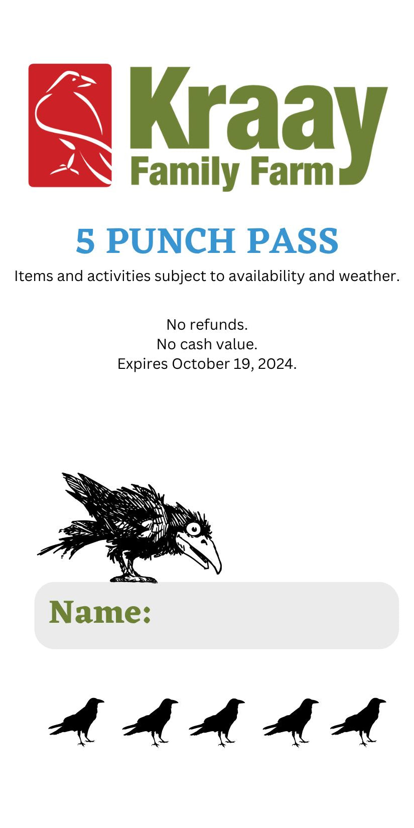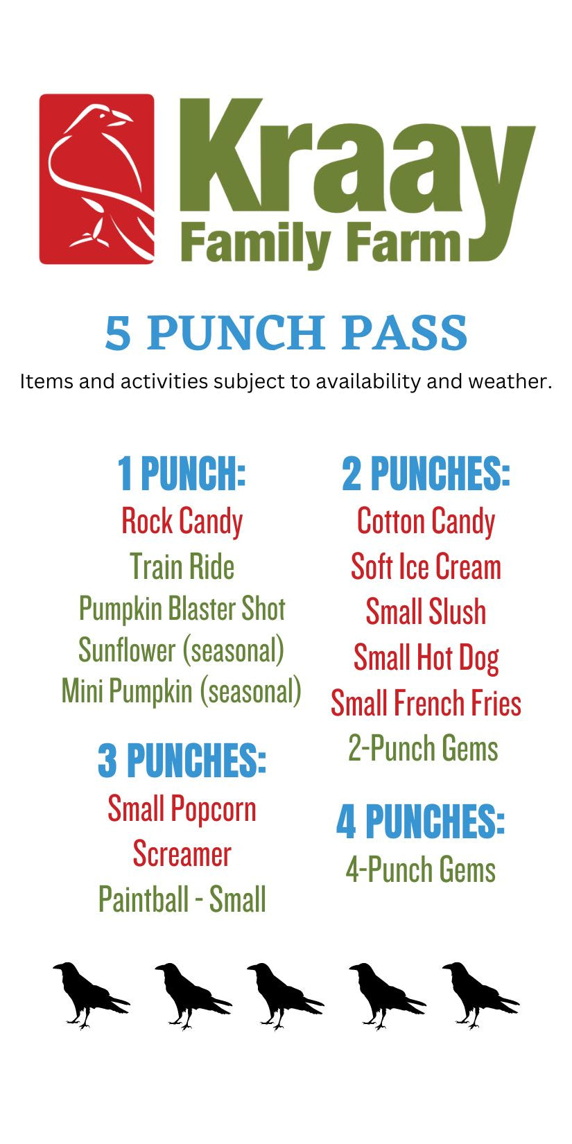 Some activities are not included with your general admission and require the purchase of a Punch Pass ($9 for 5 punches and $16 for 10 punches, or individual purchase. Punch Passes can be purchased online or at the gate for the same price. For Punch Passes bought online we will scan your Punch Pass ticket at the gate and hand you a physical punch pass to use at the farm. Here are the activities included on the Punch Pass. There are also some food and drink options as well: